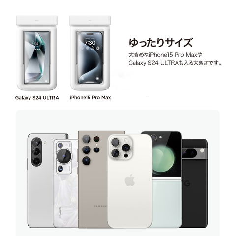 大きめなiPhone15 Pro MaxやGalaxy S24 ULTRAも入る大きさです。