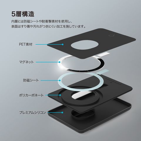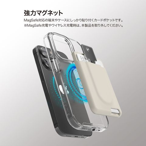 MagSafe対応の端末やケースにしっかり貼り付くカードポケットです。※MagSafe充電やワイヤレス充電時は、本製品を取り外してください。