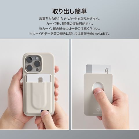 表裏どちら側からでもカードを取り出せます。カード2枚、鍵1個の収納可能です。※カード、鍵の紛失には十分ご注意ください。※カード内データ等の損失に関しては責任を負いかねます。