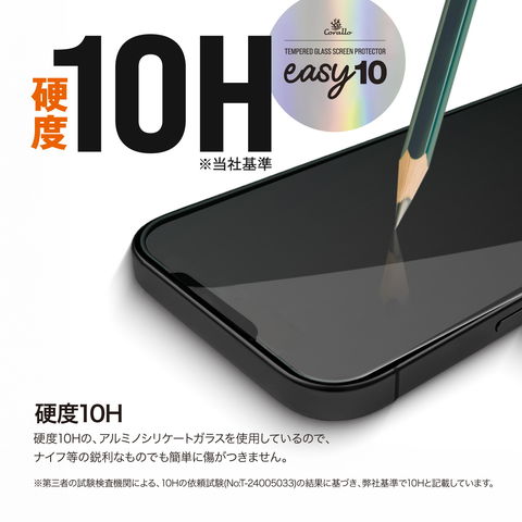 硬度10H のアルミノシリケートガラスを使用しているので、ナイフ等の鋭利なものでも簡単に傷がつきません。