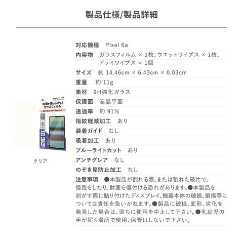 ●本製品は薄い黄色味を帯びていますが、画面に貼ると目立ちにくくなります。●本製品が割れる際、または割れた破片で、怪我をしたり、財産を傷付ける恐れがあります。●本製品を剥がす際に貼り付けたディスプレイ、機器本体の破損、損傷等については責任を負いかねます。●製品に破損、変形、劣化を発見した場合は、直ちに使用を中止して下さい。●乳幼児の手が届く場所で使用、保管はしないで下さい。
