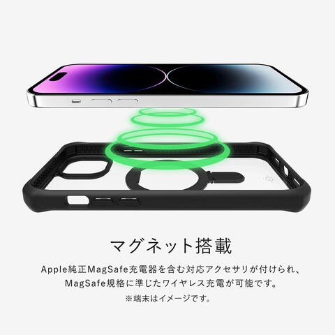 Apple純正MagSafe充電器を含む対応アクセサリが付けられ、MagSafe規格に準じたワイヤレス充電が可能です。