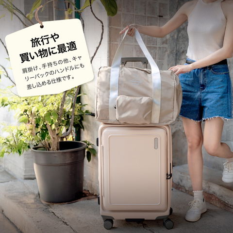 肩掛け、手持ちの他、キャリーバックのハンドルにも差し込める仕様です。