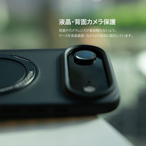 液晶やカメラレンズが直接触れないよう、ケースを液晶画面・カメラより高めに設計しています。
