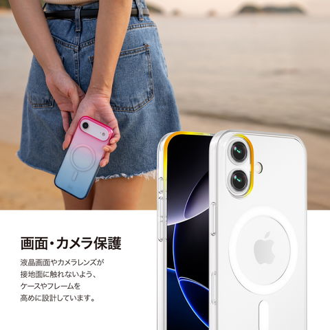 液晶やカメラレンズが直接触れないよう、ケースを液晶画面・カメラより高めに設計しています。