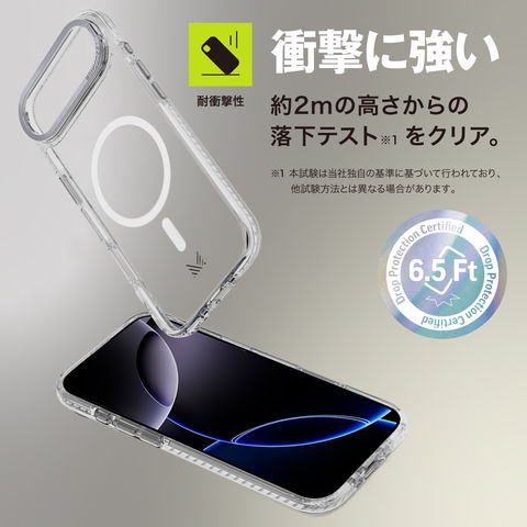 衝撃吸収性の高いTPUとポリカーボネートを組み合わせた、耐衝撃ケースです。約2mからの落下テストを独自テストでクリアしています。