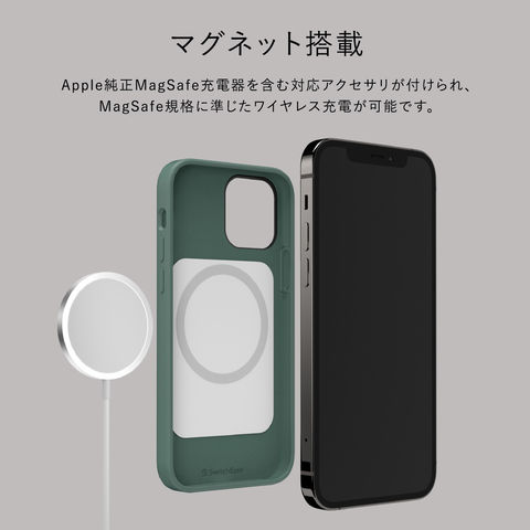 Apple純正MagSafe充電器を含む対応アクセサリが付けられ、MagSafe規格に準じたワイヤレス充電が可能です。