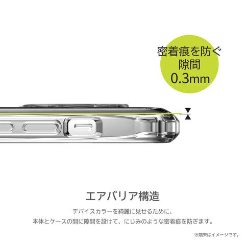デバイスカラーを綺麗に見せるために、本体とケースの間に隙間を設けて、にじみのような密着痕を防ぎます。