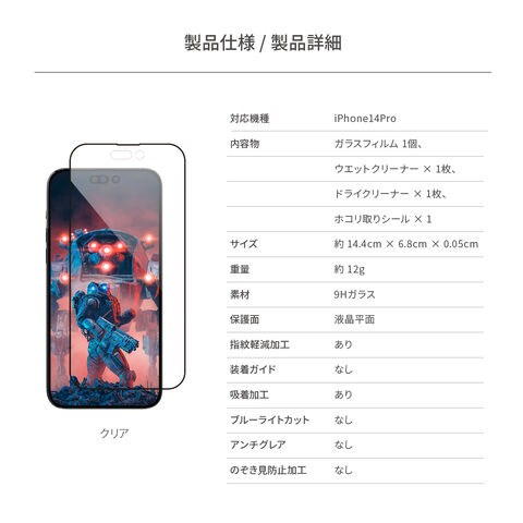 ガラスフィルム 1個、ウエットクリーナー × 1枚、ドライクリーナー × 1枚、ホコリ取りシール × 1枚