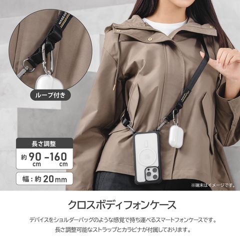 デバイスをショルダーバッグのような感覚で持ち運べるケースです。長さ調整可能なストラップと、カラビナやキーリング等を装着できるループ付きです。