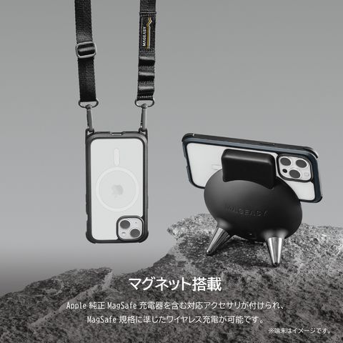 Apple純正MagSafe充電器を含む対応アクセサリが付けられ、MagSafe規格に準じたワイヤレス充電が可能です。