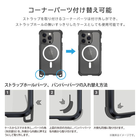 ストラップを取り付けるコーナーパーツは付け外しができ、ストラップホールの無いすっきりしたケースとしても使用可能です。