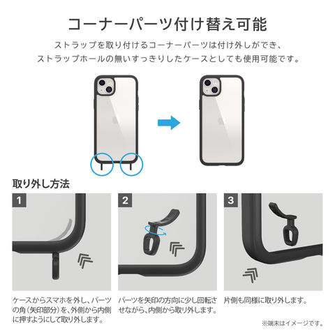 ストラップを取り付けるコーナーパーツは付け外しができ、ストラップホールの無いすっきりしたケースとしても使用可能です。