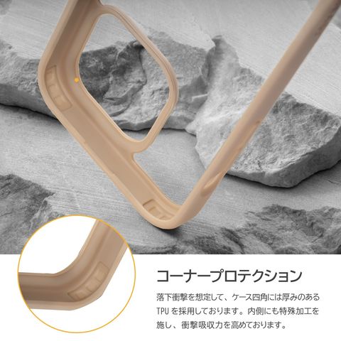 落下衝撃を想定して、ケース四角には厚みのあるTPUを採用しております。内側にも特殊加工を施し、衝撃吸収力を高めております。
