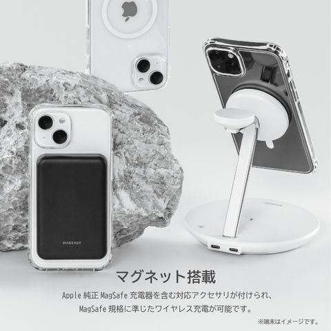 Apple純正MagSafe充電器を含む対応アクセサリが付けられ、MagSafe規格に準じたワイヤレス充電が可能です。