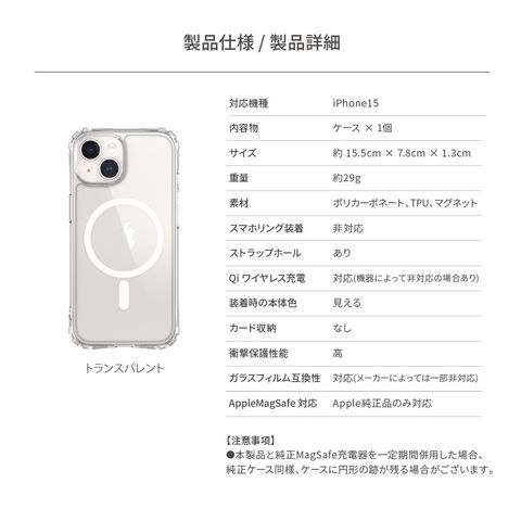 iPhone15 耐衝撃 ケース Magsafe 対応 米軍 MIL規格 耐衝撃ケース 透明 薄型 カバー Apple iPhone 15 アイフォン15 対応 MagEasy Atoms M