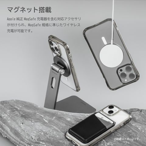 Apple純正MagSafe充電器を含む対応アクセサリが付けられ、MagSafe規格に準じたワイヤレス充電が可能です。