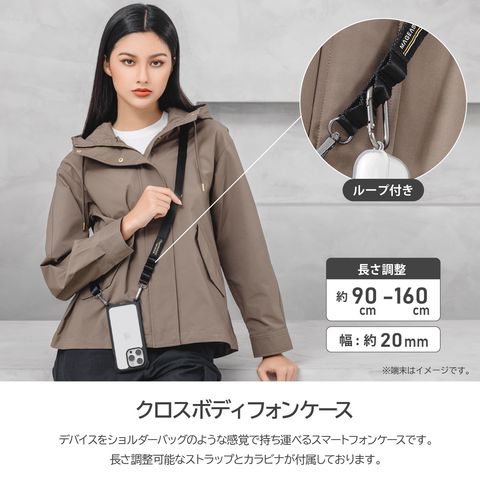 デバイスをショルダーバッグのような感覚で持ち運べるケースです。長さ調整可能なストラップと、カラビナやキーリング等を装着できるループ付きです。