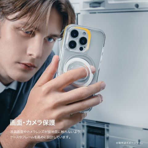 液晶画面やカメラレンズが接地面に触れないよう、ケースやフレームを高めに設計しています。