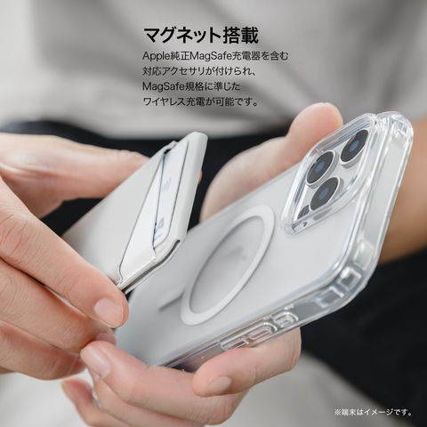 Apple純正MagSafe充電器を含む対応アクセサリが付けられ、MagSafe規格に準じたワイヤレス充電が可能です。