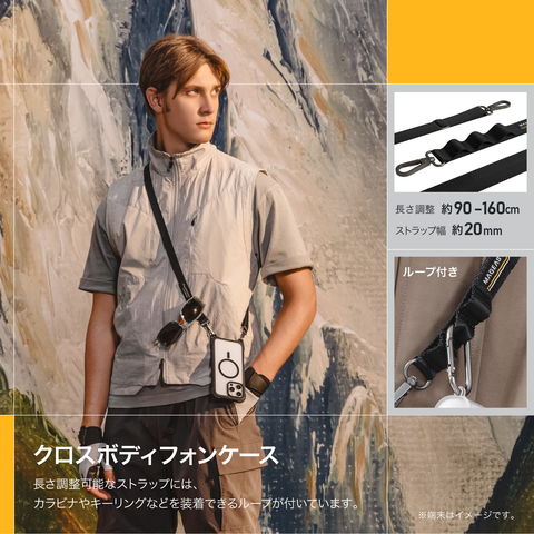 長さ調整可能なストラップには、カラビナやキーリングなどを装着できるループが付いています。
