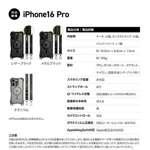 TPU、ポリカーボネート、マグネット、ナイロン、亜鉛合金(レザーブラック除く)