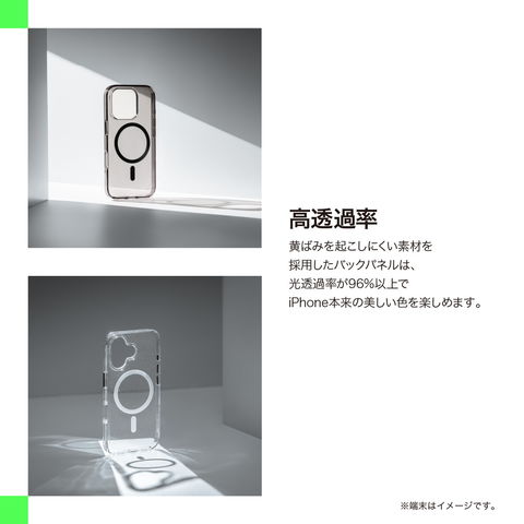黄ばみを起こしにくい素材を採用したバックパネルは、光透過率が96%以上でiPhone本来の美しい色を楽しめます。