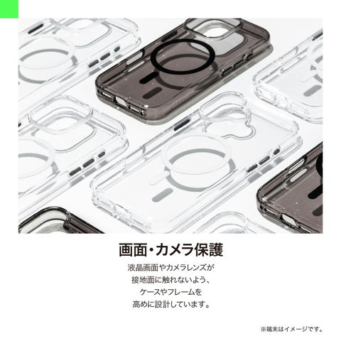 液晶画面やカメラレンズが接地面に触れないよう、ケースやフレームを高めに設計しています。