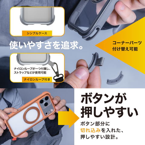 用途に合わせて、衝撃吸収タイプとアクセサリー対応タイプを簡単に付け替えできます。