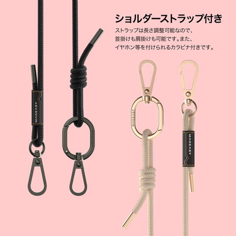 ストラップは長さ調整可能なので、首掛けも肩掛けも可能です。また、イヤホン等を付けられるカラビナ付きです。