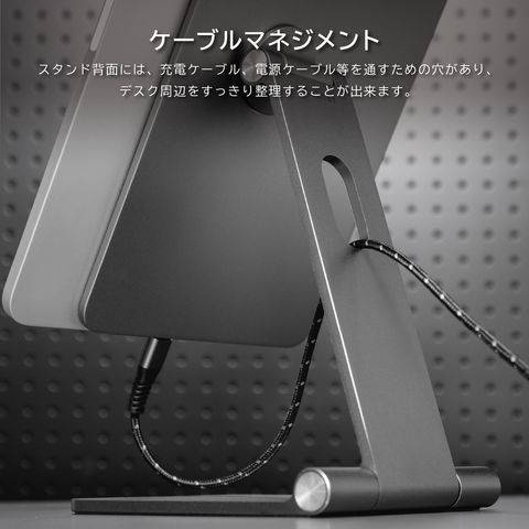 スタンド背面には、充電ケーブル、電源ケーブル等を通すための穴があり、デスク周辺をすっきり整理することが出来ます。