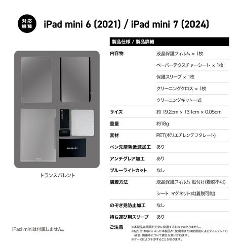 液晶保護フィルム × 1枚、ペーパーテクスチャーシート × 1枚、保護スリーブ × 1枚、クリーニングクロス × 1枚、クリーニングキット一式