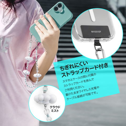 スマホとケースの間に付属のストラップカードを挟んでご利用ください。着けたままワイヤレス充電やケーブル接続が可能です。