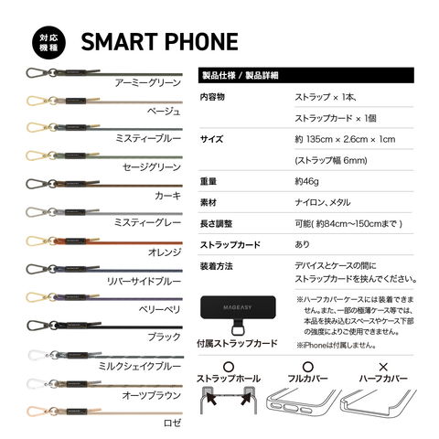 SMART PHONE 各種 スマホショルダー 斜めがけ / 首掛け / 肩掛け スマホストラップ 長さ調節 可能 細め 幅 6 mm ストラップ MagEasy Strap+ Strap Card (6mm)