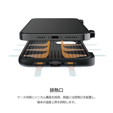 ケース内側にハニカム構造を採用、側面には排熱口を配置し、端末の温度上昇を抑制します。