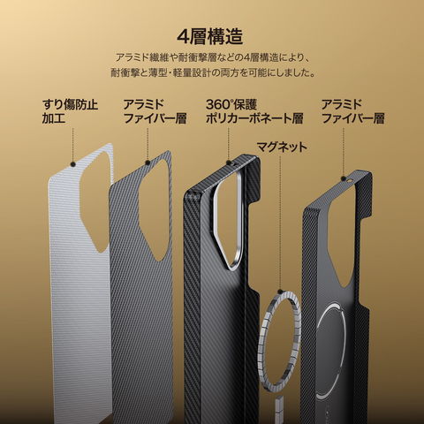アラミド繊維や耐衝撃層などの4層構造により、耐衝撃と薄型・軽量設計の両方を可能にしました。
