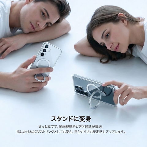 さっと立てて、動画視聴やビデオ通話が快適。指にかければスマホリングとしても使え、持ちやすさも安定感もアップします。