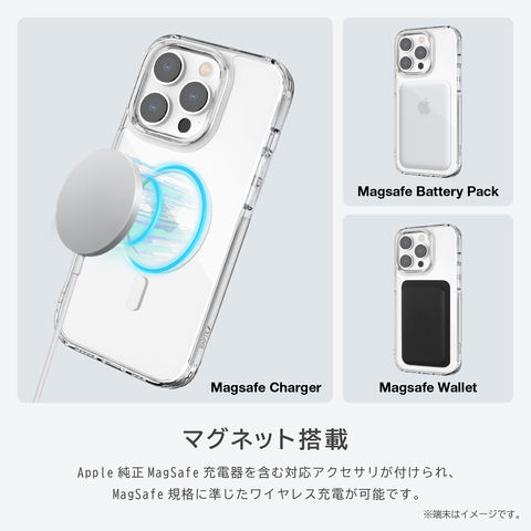 Apple純正MagSafe充電器を含む対応アクセサリが付けられ、MagSafe規格に準じたワイヤレス充電が可能です。