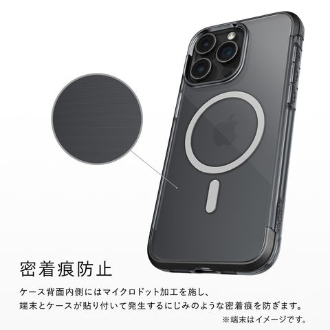 ケース背面内側にはマイクロドット加工を施し、端末とケースが貼り付いて発生するにじみのような密着痕を防ぎます。