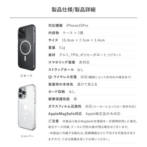 iPhone15Pro ケース Magsafe 対応 米軍 MIL規格 クリア 耐衝撃 アルミ フレーム カバー Apple iPhone15 Pro アイフォン15 プロ 対応 RAPTIC Air MagSafe