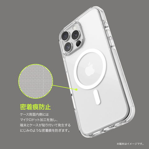 ケース背面内側にはマイクロドット加工を施し、端末とケースが貼り付いて発生するにじみのような密着痕を防ぎます。