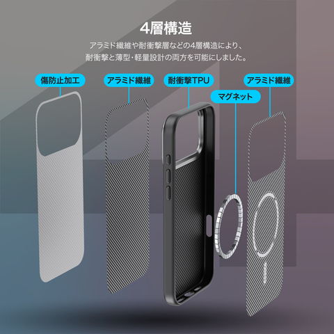 アラミド繊維や耐衝撃層などの4層構造により、耐衝撃と薄型・軽量設計の両方を可能にしました。