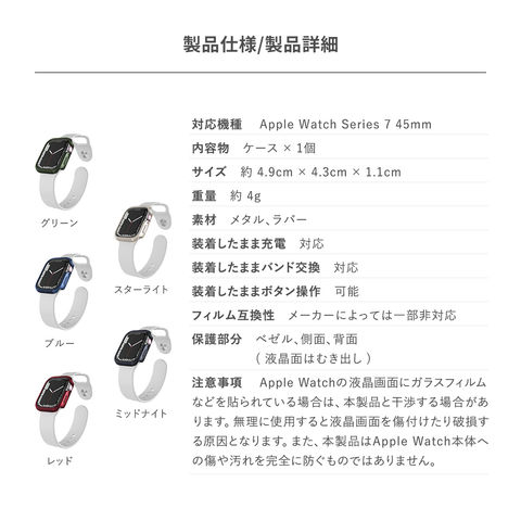 Apple Watchの液晶画面にガラスフィルムなどを貼られている場合は、本製品と干渉する場合があります。無理に使用すると液晶画面を傷付けたり破損する原因となります。また、本製品はApple Watch本体への傷や汚れを完全に防ぐものではありません。