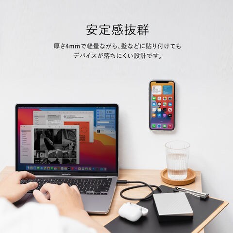 厚さ4mmで軽量ながら、壁などに貼り付けてもデバイスが落ちにくい設計です。