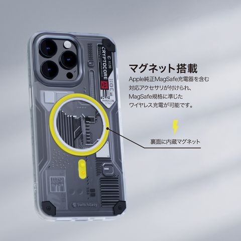 Apple純正MagSafe充電器を含む対応アクセサリが付けられ、MagSafe規格に準じたワイヤレス充電が可能です。