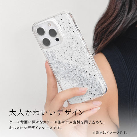 ケース背面に様々なカラーや形のラメ素材を閉じ込めた、おしゃれなデザインケースです。