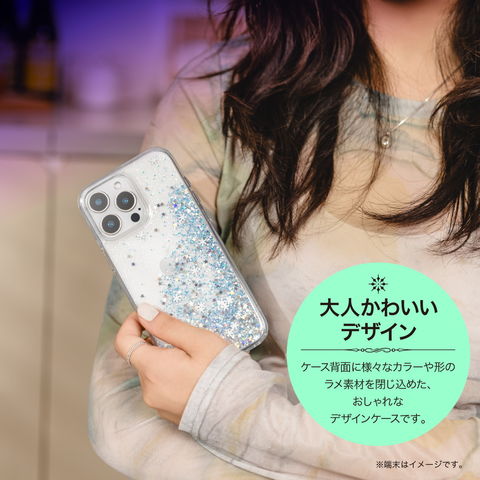 ケース背面に様々なカラーや形のラメ素材を閉じ込めた、おしゃれなデザインケースです。