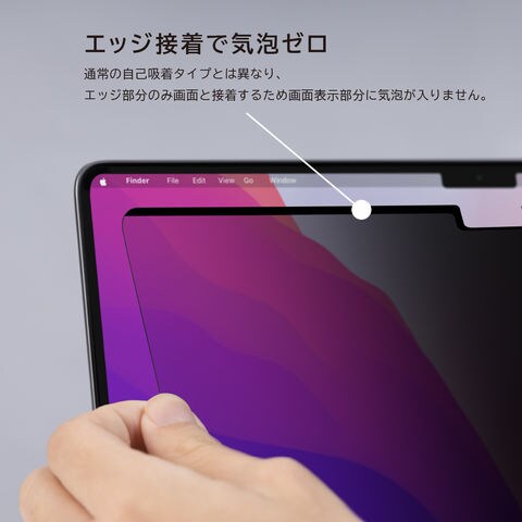 通常の自己吸着タイプとは異なり、エッジ部分のみ画面と接着するため画面表示部分に気泡が入りません。