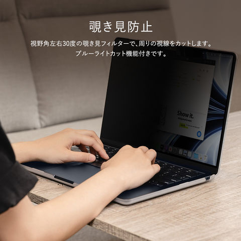 視野角左右30度の覗き見フィルターで、周りの視線をカットします。ブルーライトカット機能付きです。