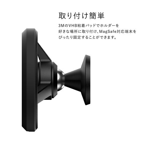 3MのVHB粘着パッドでホルダーを好きな場所に取り付け、MagSafe対応端末をぴったり固定することができます。